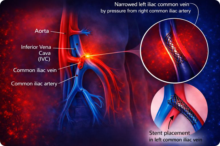 • A stent is placed to open the vein and restore blood return from the left leg to the heart